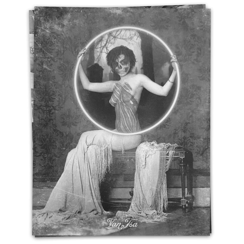 Inspired by the cabinet cards of the late 1800’s and French post cards of the early 1900’s. These modified vintage photographs feature nude women donning a VanTsa aesthetic. The backgrounds are filled with either a painting or mural previously done by VanTsa. The women are masked and adorned with body art creating by VanTsa, the work was brought over to these images from old photos and body painting sessions.